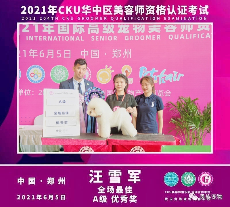 武漢貴族寵物美容培訓學校優秀學員汪雪軍同學榮獲2021年CKU美容認證考試A級特別優秀獎及全場最佳